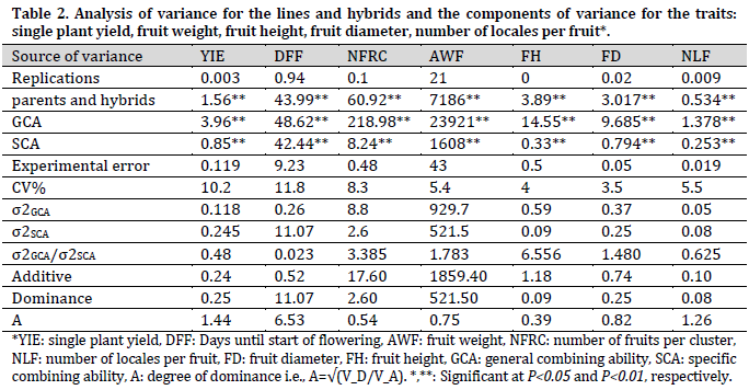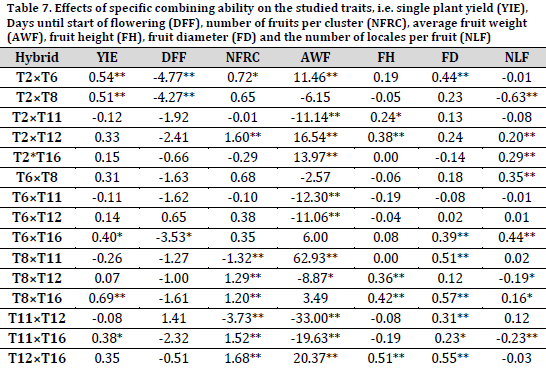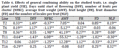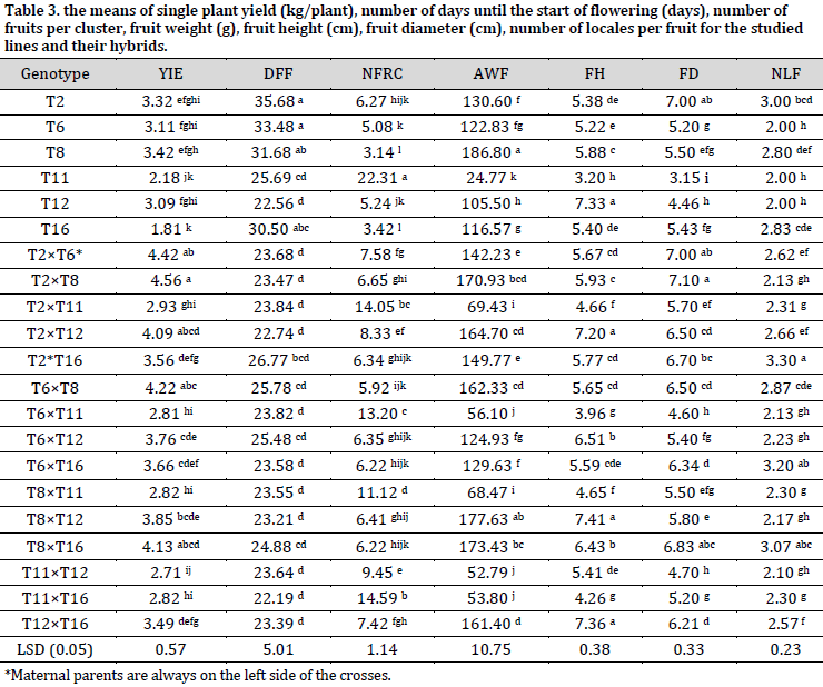 Single plant yield GCA effects in T8 (0.36), T6 (0.19), T2 (0.33) were significantly positive. Therefore, those lines could be used as a donor of this trait (Table 6). Regarding the number of days until the start of flowering, which is an index of earliness, T11 and T12 scored the highest significant negative effects (-1.43 and -2.03). Thus, these two lines could be used in producing early maturing hybrids [7][22]. As for the number of fruits per cluster, T11 scored a significant positive GCA, while other lines had significant negative GCAs. Based on these results, T11 could be helpful in improving the number of fruits per cluster. T8 scored the highest significant positive GCA effects for average fruit weight, followed by T12 and T2. In fact, T8 can be suggested in breeding programs to introduce fruits with higher weights, heights, and diameters (higher volume), while T2 is suggested to produce types with higher fruit weight and wider diameter [5][22][25].