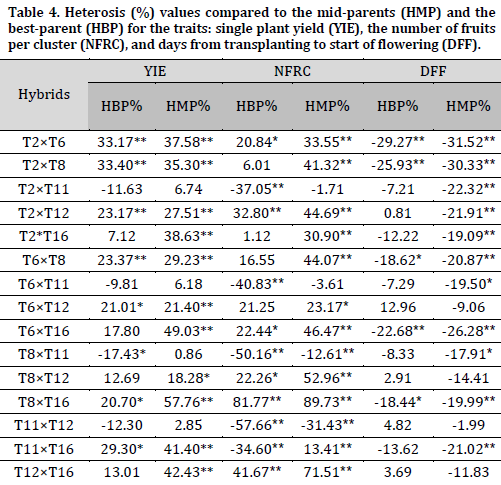 In terms of the number of fruits per cluster, eleven hybrids showed significant positive desirable heterosis compared to the mid-parents ranging between 13.41-89.73%. Also, six hybrids showed significant positive desirable heterosis compared to the best parent, and the highest heterobeltiosis was recorded in the hybrid (T8×T16) (81.77%) (Table 4).
