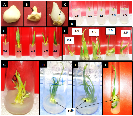 No significant changes in leaves number per shoot were observed between the treatments. However, the highest leaves numbers per shoot were recorded under 1.0 and 1.5 mg L-1 BA treatments with averages of 3.33 leaves per shoot while the lowest was recorded under 2 mg L-1 with 1.33 leaves per shoot (Table 1). (Fig. 1 H, I and J) shows swelling of shoot bases, initiation, and formation of bulbs eight weeks after culturing in MS medium supplemented with 1.0 mg L-1 benzyl adenine and 0.5 mg L-1 naphthalene acetic acid. The reason for this swelling is the accumulation of carbohydrates and nutrients to develop reproductive parts called bulbs [10].