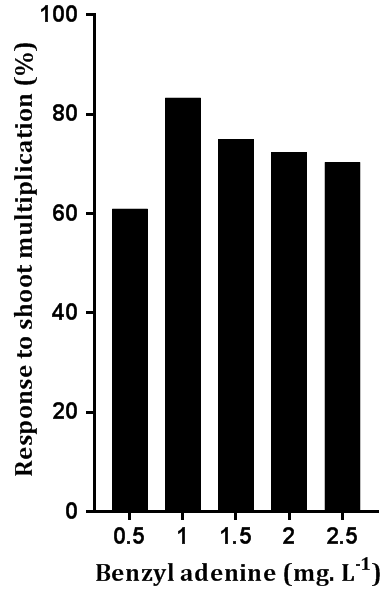 The current study was carried out to investigate the effect of different benzyl adenine concentrations in culture medium on the axillary buds response of ‘Arma’ tulip cultivar to shoot multiplication in addition to the number of lateral shoots per explant, the number of leaves per shoot, and the length of shoots. For this purpose, Murashige and Skoog medium was supplemented with 0.5 mg L-1 naphthalene acetic acid and various levels (0.5, 1, 1.5, 2, and 2.5 mg L-1) of benzyl adenine. The previously mentioned indices were monitored after eight weeks of culturing. The results showed that 1 mg L-1 benzyl adenine treatment resulted in a significant increase in the percentage of response to shoot multiplication which reached 83.33% after eight weeks of culture. However, apical buds did not respond to shoot multiplication under any of the tested concentrations. Additionally, the axillary buds growing on the MS medium with a concentration of 1.0 mg L-1 benzyl adenine recorded an increase in shoots number and length compared to other treatments with 5.33 shoots per explant and 5.67 cm, respectively. While 0.5 mg L-1 benzyl adenine recorded the lowest shoot multiplication response, shoots length, and number of leaves per shoot (61.0%, 2.33 cm, and 1.67 leaves per shoot, respectively).