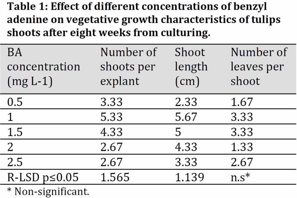 Taking into consideration that the ultimate aim of in vitro tulip propagation is to obtain a large number of plants that are genetically similar to the mother plant and free of viruses within a short period compared to the traditional propagation method, the current study aimed to investigate the effect of different BA levels in culture medium on the propagation of ‘Arma’ tulip in vitro cultures.