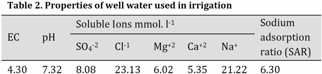 All phosphorus was added at sowing, while nitrogen was split into two equal doses at tillering and booting stages. Potassium, Iron, zinc, and manganese soil and foliar application were added at the booting stage. The treatments were arranged in a completely randomized design (R.C.B.D.) in three replicates. All treatments were irrigated with brackish well water (Table 2) until harvest. The plants were harvested at maturity stage. Total dry matter and grains yield per pot were recorded.