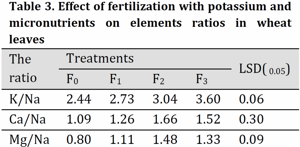 The effect of fertilization with potassium and microelements on K/Na, Ca/Na and Mg/Na ratio in leaves of wheat during the flowering stage is given in (Table3). Results showed that the concentration ratios in the wheat leaves were significantly affected by the application of K, Fe, Zn, and Mn. This application induced an increase in K/Na, Ca/Na, and Mg/Na ratios in leaves. The increase was more pronounced in K/Na ratio which was 2.44, 2.73, 3.04, and 3.60 under F0, F1, F2, and F3 treatment, respectively. The highest K/Na ratios were obtained under (F2) and (F3) treatments. This increase in K/Na ratio may be attributed to trace elements’ role in increasing the capability of the root system for selectivity uptake of K+ ion and the limitation of Na ion uptake in the leaves [28][29]. This indicates that the addition of potassium and trace elements with regular fertilizer dose can increase salt tolerance of wheat by reducing Na uptake. [1][30] reported that the plant which is capable of maintaining a high ratio of K/Na has high salinity tolerance.
