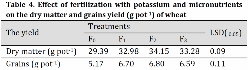 Effect of the selected fertilization treatments on dry matter and grain yield (g pot-1) of wheat is given in (Table 4). Results indicated that there was a significant effect of potassium and trace elements application on the total dry matter. The highest dry matter was recorded under F2 treatment (34.2 g pot-1). On the other hand, the lowest dry matter value was (29.40 g pot-1) was obtained under treatment F0 treatment. The recorded increases in the dry matter over that of control (F0) were 12.22, 16.20, and 13.24% under F1, F2, and F3 fertilization treatments, respectively.