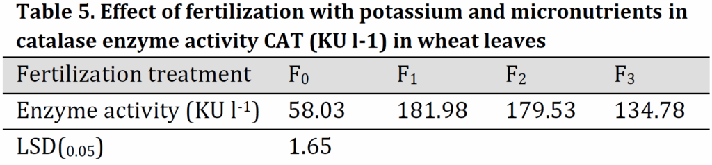 Higher CAT activity was observed under the soil application of K (F1) compared to other treatments (181.98 KU.l-1) which was three folds higher than that of the control treatment (F0). On the other hand, enzyme activity under conventional fertilizer dose was 58.03 KU.l-1, which is significantly lower than other treatments (Table 5). The differences between F2 (foliar application) and F3 can be explained by the fact that concentration of Mn, Zn, Fe, Ca, and K nutrients in wheat plants at F3 treatment were not enough to increase the enzyme’s activity to counteract salt stress. This may be attributed to the precipitate part of the added micronutrients due to higher pH and carbonate content in the used clay soil [33]. The increments in CAT activity helped plant in scavenging H2O2 which is generated in normal or abnormal conditions. Additionally, CAT activity maintained the ascorbate pool and activated the defense system of plant cells which in turn led to an increase in wheat plant tolerance and maintained the best growth under saline conditions [2][34]. These results confirm that this enzyme is more effective in wheat when K, Fe, Zn, and Mn were added either to the soil or foliar application. This is due to the fact that K and micronutrients are necessary for the synthesis of proteins and the effectiveness of enzymes as it is a carrier element and acts to change the shape and configuration of the active site in the enzyme molecule to obtain better binding between the substrate and the enzyme [35-37].