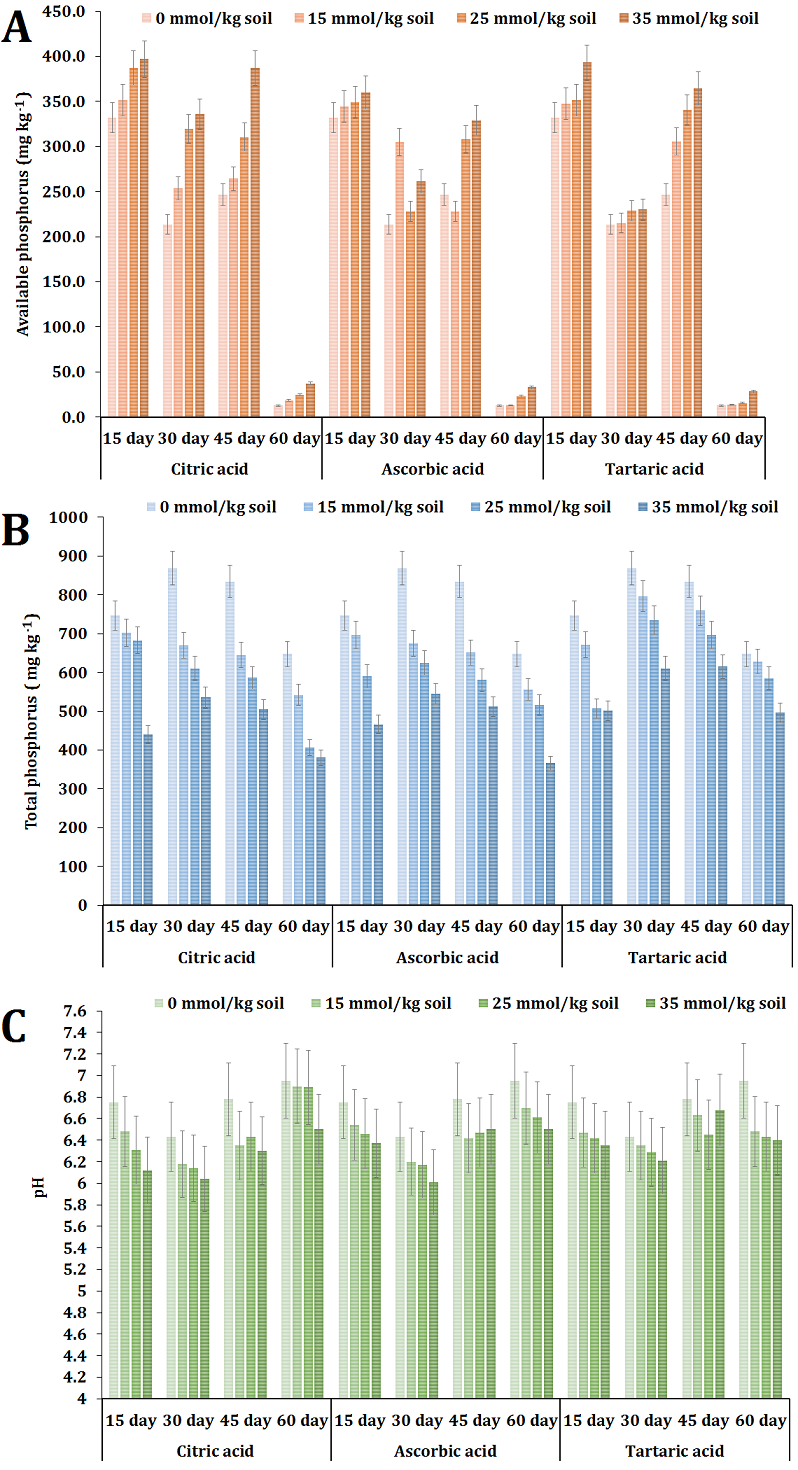 The experimental findings indicated that the application of citric acid at concentrations of 25 and 35 mmol/kg soil led to a notable enhancement in the availability of phosphorus during the course of the study, in comparison to the control group. At the 15-day mark of the experiment, it was observed that neither of the administrations of ascorbic acid led to a statistically significant enhancement in phosphorus availability. Nonetheless, the administration of ascorbic acid at concentrations of 25 and 35 mmol/kg soil resulted in a considerable enhancement of accessible phosphorus levels following 45 and 60 days of treatment. In a similar manner, it was observed that all three doses of tartaric acid led to elevated amounts of accessible phosphorus following a 45-day incubation period (Fig. 1 A). The application of citric acid at concentrations of 25 and 35 mmol/kg soil demonstrated higher levels of phosphorus availability compared to control (average of 201.25 mg/kg P) and other treatments, resulting in available phosphorus concentrations of 260.45 and 289.33 mg/kg P, respectively.