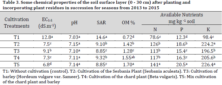 The treatments of cultivation and incorporating plant dry matter in the soil surface layer reduced the electrical conductivity of the soil significantly compared to control treatment. The most pronounced decrease was observed in T5 (Mix cultivation of the chard plant and barley) (Table 3). The sodium adsorption ratio decreased in all cultivation treatments to less than 10, which is suitable for the growth of most plants [10], while control treatment recorded a SAR of 14.6. No relative differences were observed between treatments and control in terms of pH values. A noticeable improvement in organic matter level was observed in all cultivation treatments reaching 1.70% in the treatment of chard + barley compared to control (0.72%). This observation is due to the dry matter decomposition degree of chard + barley (T5) over time is higher than that of sesbania (T2) and barley (T3). Also, It was noted that the added amount of residues and their decomposition degree were reflected on the available nutrients content and improved soil fertility compared to what they were before the experiments were performed (Table 1). Nutrient content reached 141, 20.5, and 226.4 mg. kg-1 soil for nitrogen, phosphorous, and potassium, respectively, in the chard + barley treatment (T5). These findings refer to the importance of cultivation and incorporating the dry matter of plants in reducing the adverse effect of salt stress in soil and plant and improving soil fertility and further confirms previous results in this field [14][28]. Furthermore, the results highlight the role of sesbania, chard, and barley plants in causing noticeable chemical changes in soils through the release of organic carbon and roots exudates [30][31], changing soil acidity [32], addition of organic matter and nutrients [13][20][33-36] and increasing decomposition of calcium carbonate in the presence of CO2 from the decomposition of organic matter and respiration of plant roots [8][37][38].