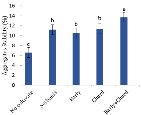 It was found that the cultivation and incorporation treatments resulted in a significant increase in the soil aggregates stability, where the residues of chard + barley showed the highest segregate stability values (13.7%), followed by chard, sesbania, and barley with 11.4, 11.2, and 10.5%, respectively. The comparative control (without culture) gave the lowest stability rate (6.6%) (Fig. 1). The increase in the stability of soil aggregates when adding plants residues is due to the role of organic matter in carbohydrates formation. The decomposition by microbial activity and the release of organic acids assist aggregates’ stability. For instance, fulvic acid and polysaccharides play an essential role in the presence of calcium and magnesium ions in increasing the stability of aggregates [39]. Additionally, organic matter encapsulates soil particles and reduces the wetting speed [40]. The reason for varying aggregates stability values may be due to the different degrees of decomposition of each plant additive and the release of organic acids to the root zone of the soil. These results are consistent with other findings [36][41-43] on the role of plant residues in improving soil aggregates’ stability.