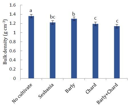 It is noted that the treatment of chard + barley significantly outperformed all the treatments in this attribute (Fig. 2). The lower soil bulk density observed when adding organic residues is due to the role of organic matter in improving soil structure and increasing the soil aggregates’ stability. These results are consistent with [43][44] who found a decreased soil bulk density with the addition of different levels of organic matter.