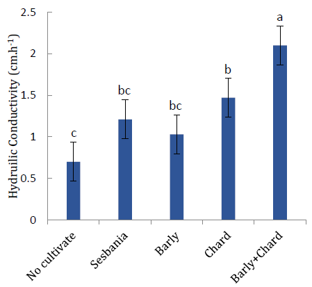 The cultivation treatments and incorporation of the dry matter in the topsoil layer resulted in a significant increase in the soil hydraulic conductivity. The lowest conductivity value was recorded by control (0.70 cm.h-1), while the chard, sesbania, and barley residues gave 1.47, 1.21, and 1.03 cm.h-1, respectively. It is noted that the treatment of chard + barley significantly exceeded all treatments in this characteristic (2.10 cm.h-1) (Fig. 3). The reason for the increase in water conductivity of the soil when adding organic residues of cultivation plants is due to the role of organic matter in improving soil structure, reducing bulk density, and increasing the stability of soil aggregates, which leads to the increase of capillary pipes conducting water, expand their diameters and regularity reduce sprains. This is consistent with the findings of [43] that crop residues added to agricultural soils have a positive effect on their water properties as well as improving most of the physical characteristics of the soil.