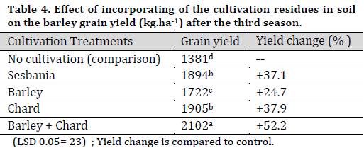 It was found that the consecutive phytomanagement treatments significantly affected the barley grain yield compared to the control treatment. It is noted that the treatment of mixed agriculture (barley + chard) has significantly outperformed all the treatments followed by the treatment of chard, sesbania, and barley (Table 5). This may be due to the different quality of the residues added to the surface layer of the soil depending on the treatment as there is inevitably a variation in the nature of the vegetative total of each plant, as well as the level of decomposition of the dry matter of each plant overtime during the three seasons. Additionally, the contributions to reducing the level of salts and increase nutrients availability to the plant, such as nitrogen, phosphorus, and potassium, differed between treatments reflected on improving of growth and yield of barley in different proportions. This is confirmed by the results of [14][20] with Barley and [19][28] with rice.