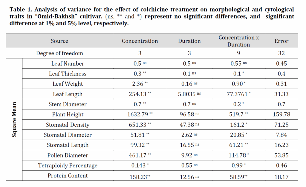 Polyploidy is occurred when two or more extra sets of the basic chromosomes are added in an organism. Autopolyploid is referred to an organism with duplication of full genome of a species [1]. Nowadays, chemical agents such as colchicine, oryzalin, taxol, vincristine, vinblastine, vinorelbine, cryptophycin, and trifluoride are used to disturb mitosis and induce polyploidy. The effect of colchicine on mitosis was first studied in mice, but its successful use in polyploidy induction was reported for the first time by Blakeslee in 1937 [2]. Subsequently, Blacksley reported successful polyploidy induction using colchicine in 48 species belong to 29 different genus and 16 families of flowering plants. One of the major advantages of colchicine treatment is related to its application in autoploidization of diploid plants.