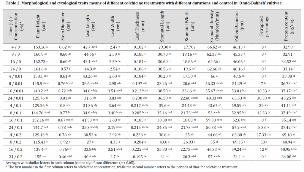 As a conclusion, colchicine treatment affected the morphological traits of “Omid-Bakhsh” forage sorghum cultivar resulting in a decrease in stem length and leaf length, with an increase in stem diameter, leaf width, leaf thickness, and protein content. However, no changes in leaf number were observed. The application of higher colchicine concentrations resulted in an increase in stomatal dimensions and pollen diameter with a decrease in stomatal density. The results of flow cytometry data showed that the highest probability of polyploidy in “Omid-Bakhsh” cultivar was contributed to 0.2% colchicine treatment and duration of 8 hours. These findings are considered promising as a starting point of introducing new tetraploid forage sorghum types with compacted stems and higher protein content.