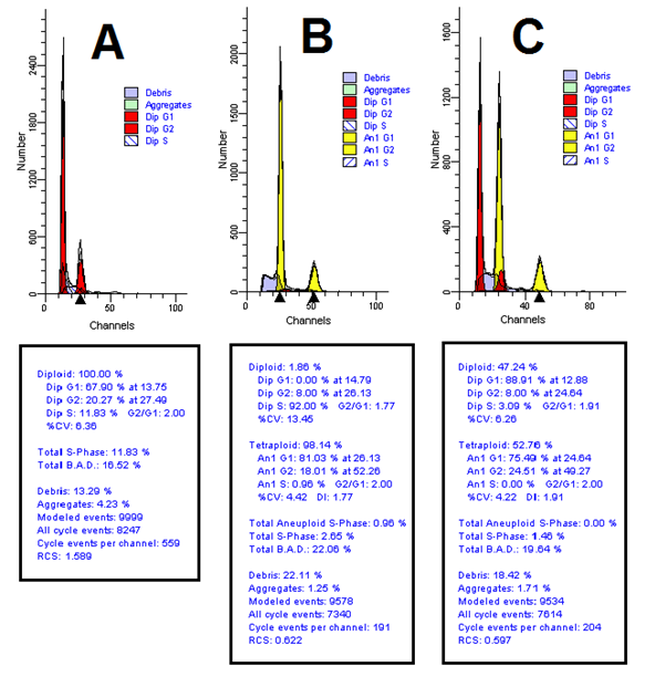 Ploidy levels were assayed using flow cytometry technique by comparing colchicine treated samples with control. Diploid plants were applied as standard specimens with two 1G and 2G peaks averaging 13.78 and 26.93 (Fig. 1)(A). Therefore, the level of DNA ploidy in these plants is 2X=2C. Flow cytometric histograms of seedlings treated with colchicine 1G and 2G peaks showed averages of 26.13 and 52.26 (Fig. 2)(B), which refers to their tetraploidy level with an estimation of 4X=2C. Furthermore, the histograms obtained from mixoploid plants also have three peaks with mean values of 13.79, 26.83 and 52.58 (Fig. 1)(C).