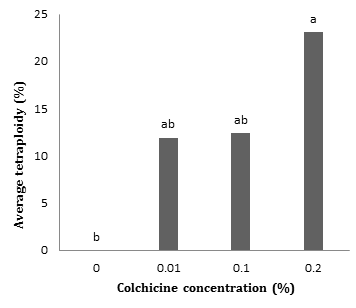 Results of analysis of variance based on flow cytometric data showed that the effect of colchicine on tetraploid percentage was significant at 5% probability level. As the concentration of colchicine increased from 0 to 0.2%, the tetraploid percentage increased from 0 to 23%. It should be noted that there was no significant difference between 0.01 and 0.1 levels of colchicine concentration. (Fig. 2).