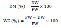 Dry matter percentage (DM%) and water content (WC%) were determined by applying the following equations: