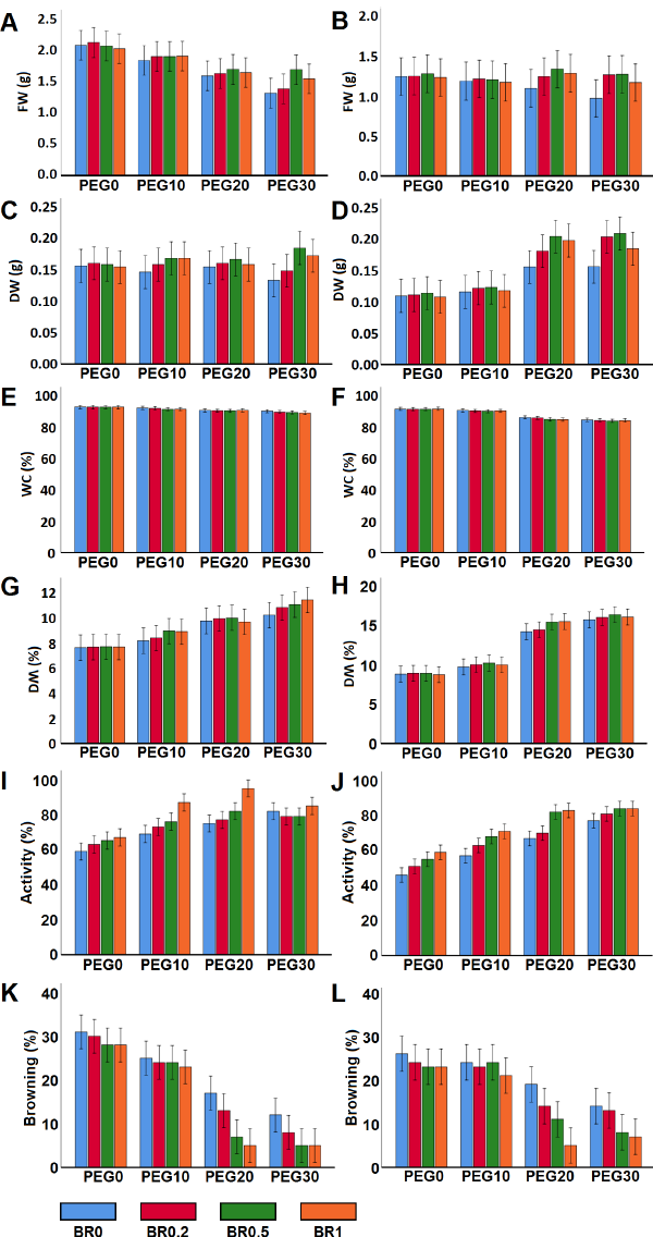 An overall increase in tissue activity was observed by increasing PEG content. Furthermore, increased tissue activity was observed by increasing BR content at each PEG level (Fig. 1 I and J). Callus activity increased in B4 and D4 treatments compared to their respective BR-free treatments (B1 and D1). A significant embryo activity increase in B3-B4 and D3-D4 treatments was recorded compared to the control and their respective BR-free (B1 and D1) treatments.