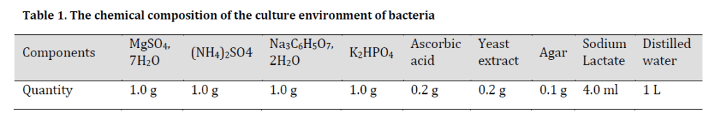A sample of water was collected from CINA (North Industrial Complex Treatment Center), 9 km north of Hassi Messaoud (South Algeria). This sample of water comes from crude separation. To examine the presence of (SRB) in this sample, a bacterial culture medium (SRB specific) [15] was prepared (Table 1). Penicillin vials were filled with 9 ml of the prepared medium with a metal nail. The vials were plugged using proper rubber plugs, purged with nitrogen to create an anaerobic environment, and sterilized by autoclaving at 120°C for 50 minutes. Then, using a syringe, 1 ml of the water sample was injected through the septum of each vial. Then, the vials were incubated at 37 °C for 28 days. By the end of the incubation period, a blackening deposit formed in the vials with an increase in environment pH which illustrated the presence of (SRB) in the water sample.