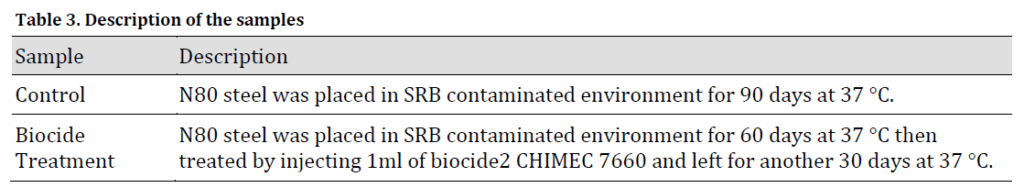 Corrosion signs were observed in both biocides treated and untreated samples; therefore, 60 days of exposure to SRB are enough to develop bacterial corrosion in untreated N80 steel.