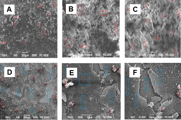 The morphological aspects of the formed deposits were inspected using scanning electron microscopy (Fig. 1). The surface of the control sample clearly demonstrated the existence of a stable adherent deposit in the form of colonies (Fig. 1 A, B and C); whereas large cleared areas were observed in the surface of Biocide treated sample (Fig. 1 D, E, and F). This indicates the high efficiency of the used Biocide in removing these deposits and preventing bacterial aggregation.