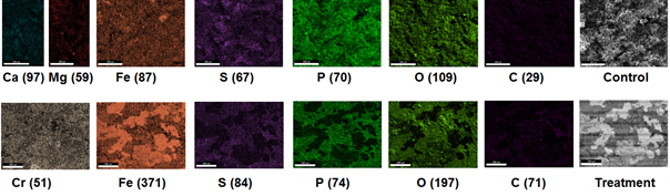 In order to understand the chemical compositions of the layer formed on N80 samples surfaces, Energy Dispersive X-ray spectrometry was used. The obtained maps were used to analyze chemical elements distribution with an allocation of color for each detected element (Fig. 2). Maps analysis results showed that the elements existed in the deposit layer were: Oxygen (O) which is here a result of water ionization, Iron (Fe) as a result of iron oxidation, Carbon (C), Calcium (Ca), Magnesium (Mg), Phosphorus (P), and Sulfur (S) which resulted from the conversion of Magnesium Sulfate and Ammonium Sulfate [7][18][19]. Sulfate-Reducing Bacteria efficiently use the compounds derived from the oxidation of sulfur as electron acceptors. These compounds such as Sulfate (SO4-2), Sulfites (SO3-2), Thiosulfates (S2O4-2), and elemental Sulfur (S°) are reduced entirely to Sulfide [18]. The biochemical reactions involved in SRB activities end with iron oxide and iron Sulfide [19] which explains the high iron oxide and Sulfide in the formed deposit.