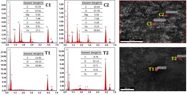 EDS spectrum analysis for the treated sample illustrated that the main surface deposits were O, Fe, and C with 98.9% in T2 scan and 100% in T1 scan for the three elements combined with only traces of S and K; while this ratio did not exceed 78.8% for the three elements combined in control sample with 22% and 21.2% Mg, Ca, P, and S combination in C1 and C2 respectively (Fig. 3). Phosphorus and sulfur precipitates are usually interpreted as an indicator for SRB activity [20] which refers to the increased activity in the non-protected steel sample in comparison to the biocide protected sample.