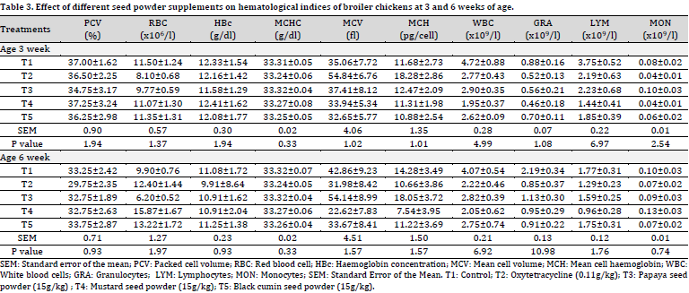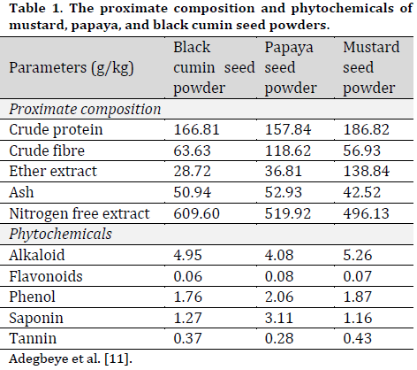 Recently, the medicinal or pharmacological properties of papaya seed, black cumin seed, and papaya seed were reported [6]. Furthermore, the effects of supplementing broiler chickens with papaya leaf and seed powders composite mix on enhancing growth efficiency characteristics and decreasing serum alanine aminotransferase and cholesterol levels were studied [7]. It was previously shown that phytogenics might affect blood parameters [8][9]. Blood haematological variables represent an effective means of assessing the health and nutritional status of animals in feeding trials [5][10]. There is currently inadequate data on the effects of supplementing broiler chickens with papaya, mustard, and black cumin seed powders on growth, haematological indices, and serum biochemical parameters. Therefore, this study aims to investigate the effects of these phytogenics on the aforementioned indices and parameters.