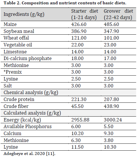 A feeding trial was performed at the JABU Teaching and Research Farm. A total of 300 Arbor Acres broiler the chicks were distributed in five treatments (10 chicks/replicate; 60 chicks/treatment) using a fully randomized experimental design. For the first seven days of brooding, the house temperature was kept at 31±2°C, but for each subsequent seven days, the temperature was lowered by 2°C until the house temperature was 26±2°C. The brooding temperature was set in this way to reduce the energy needed for temperature regulation by the chicks. During the experiment, the house was lit for 22 hours a day, and the feed and water were given ad libitum.