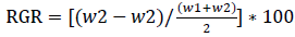 Where w2 is the weight of the broiler chickens at the onset of the experiment and w2 is the weight of the broiler chickens on the last day of the experiment.