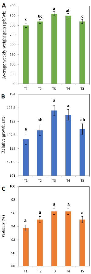 The average weekly body weight gain of the birds fed with diets T3 and T5 was significantly (P<0.05) higher compared to T1 and T5 (Fig. 1 A). The relative growth rate of broilers fed with T3 and T4 was not substantially different from that of broilers fed with T2 and T5 diets but was significantly higher (P<0.05) than that of T1 (Fig. 1 B). Although broiler chickens fed with T3 and T4 were numerically higher than other treatments, broiler chicken viability was not significantly affected by seed powder supplementation (Fig. 1 C).