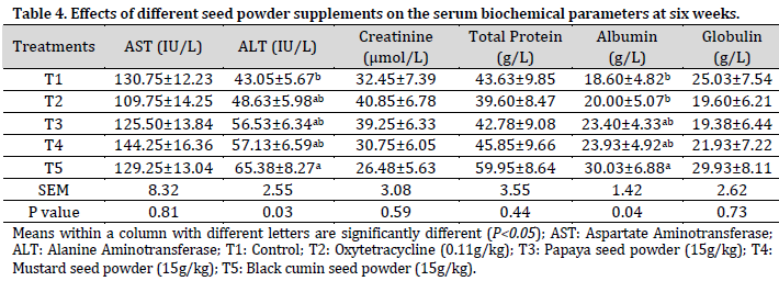 Dietary supplements had no significant effect on AST, creatinine, total protein, or globulin. The ALT serum concentration in birds fed with the diet supplemented with black cumin seed powder (T5) was statistically similar to those fed with T2, T3, and T4, but was significantly higher (P<0.05) than that of control (T1). The concentration of serum albumin recorded in the birds fed with T5 diet was similar to T3 and T4 but statistically higher (P<0.05) than T1 and T2 (Table 4).